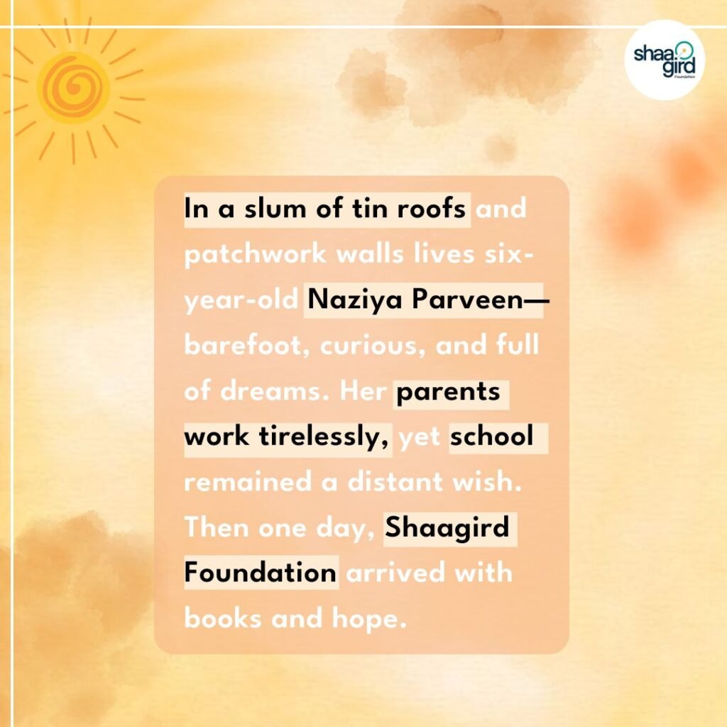 In a narrow lane tucked behind the bustling streets of the city, where the roofs are patched with tin sheets and the walls made of patchwork dreams, lives Naziya Parveen. She is six curious, bright-eyed, and barefoot most of the time. Her world is a tiny jhuggi jhopdi in a crowded slum, where the aroma of evening meals mingled with the scent of dust and determination.