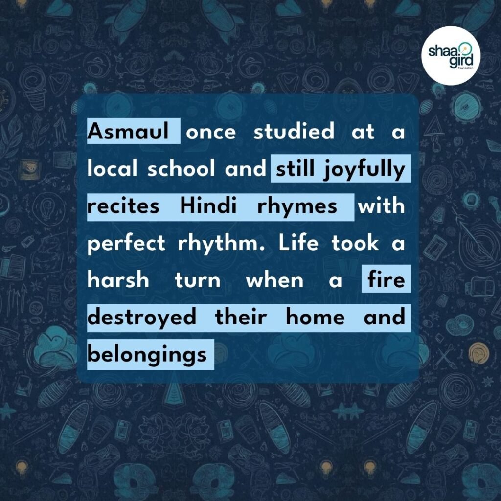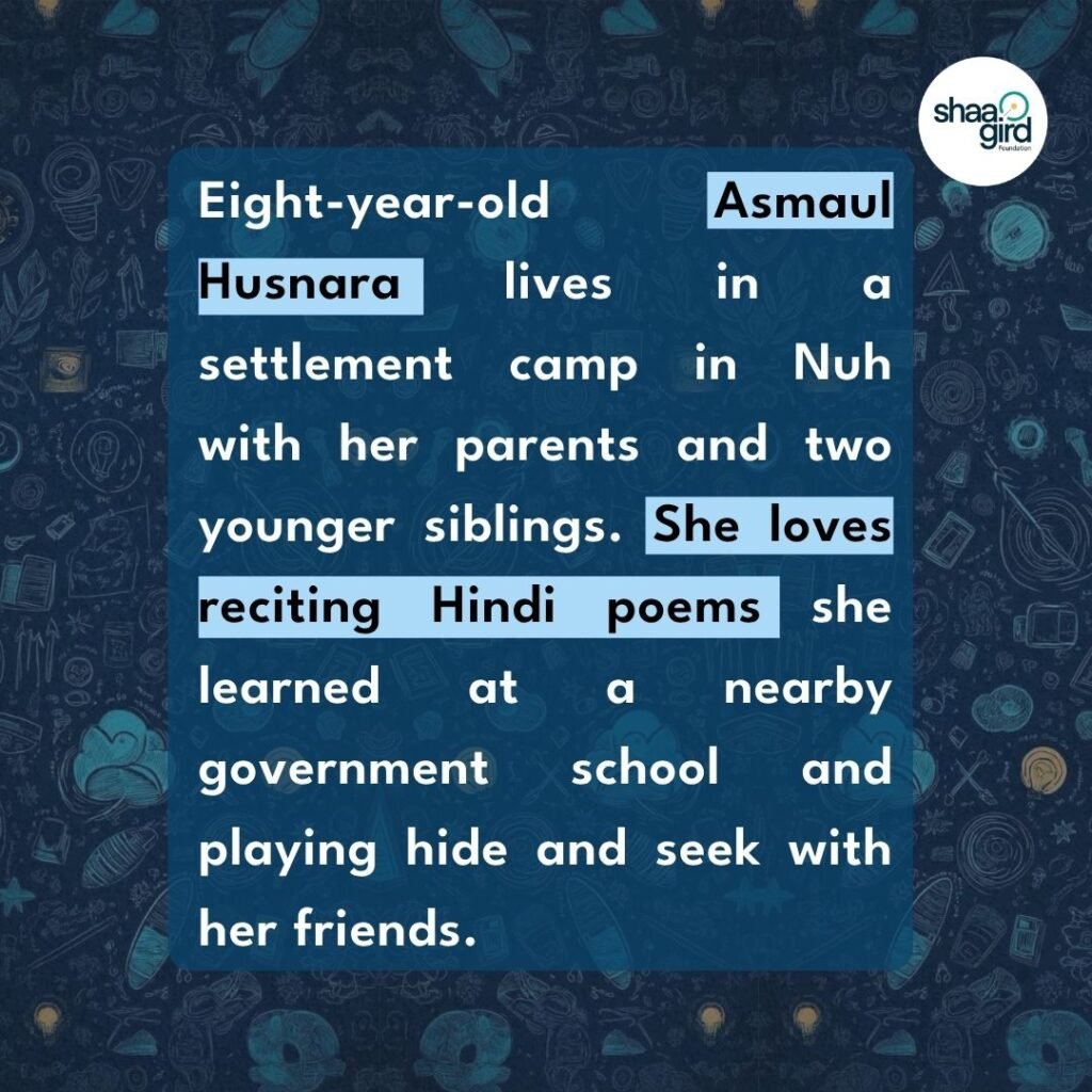 Asmaul is a sweet, cheerful girl with a shy smile and a deep love for poetry. She once attended a nearby government school, where she learned simple Hindi rhymes like Hathi Raja Bade Bade and Machhli Jaal Ki Rani Hai. Her memory for these verses is so sharp, she can recite them with full expressions and in perfect rhythm. Every time the Shaagird Foundation team visits the camp, she eagerly stands up with her friends to perform the poems, her eyes gleaming with joy and pride.