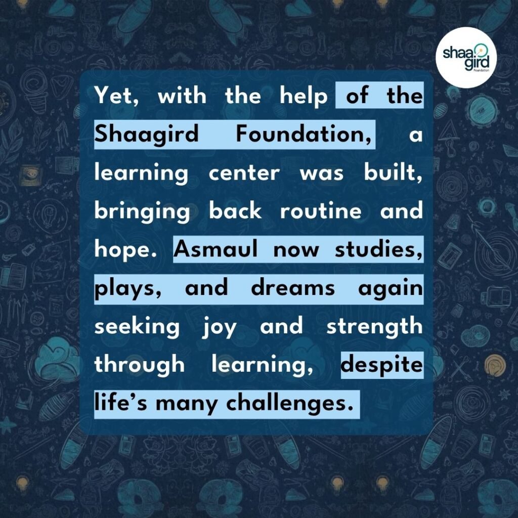 For us at Shaagird Foundation, helping Asma means more than just providing education. It’s about giving her the tools to explore the world with confidence. Like in her favorite game of hide and seek, we want her to keep seeking—not just hiding—from life’s difficulties. We want her to find joy in books, strength in learning, and the power to dream. One day, we hope to see Asma not only reciting poems but also writing her own story—one where she finds every piece of happiness that was once hidden from her.