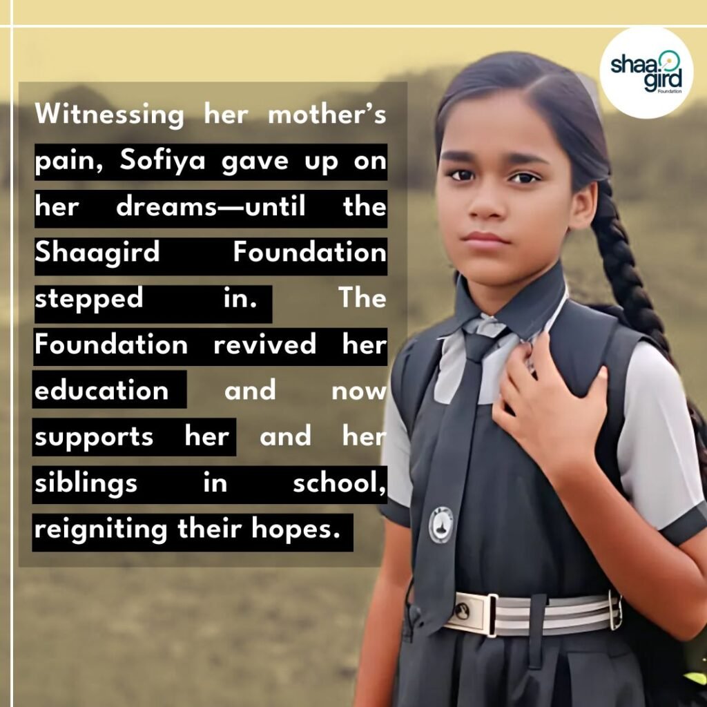 Along with her, the Shaagird Foundation has sponsored the education of her siblings—Tasleem (8th standard), Mahira (2nd standard), and Saif (2nd standard).