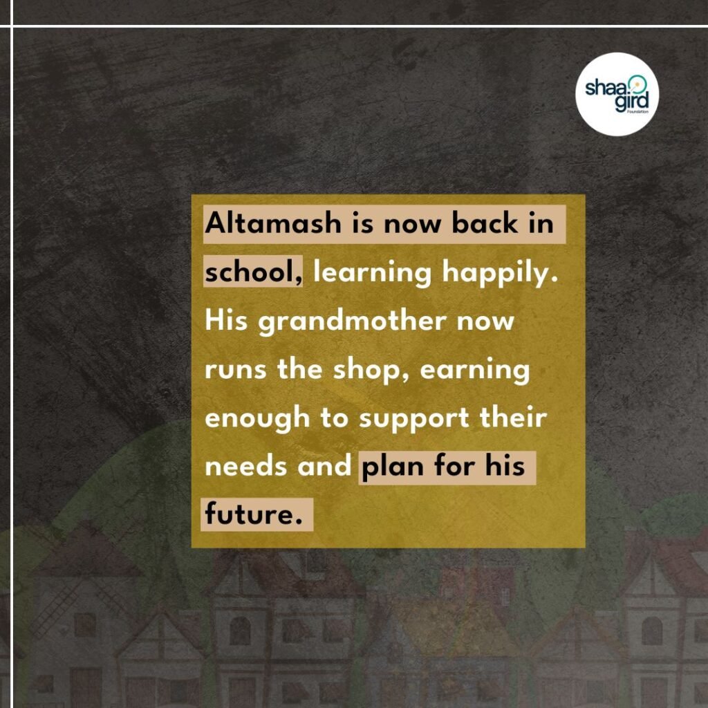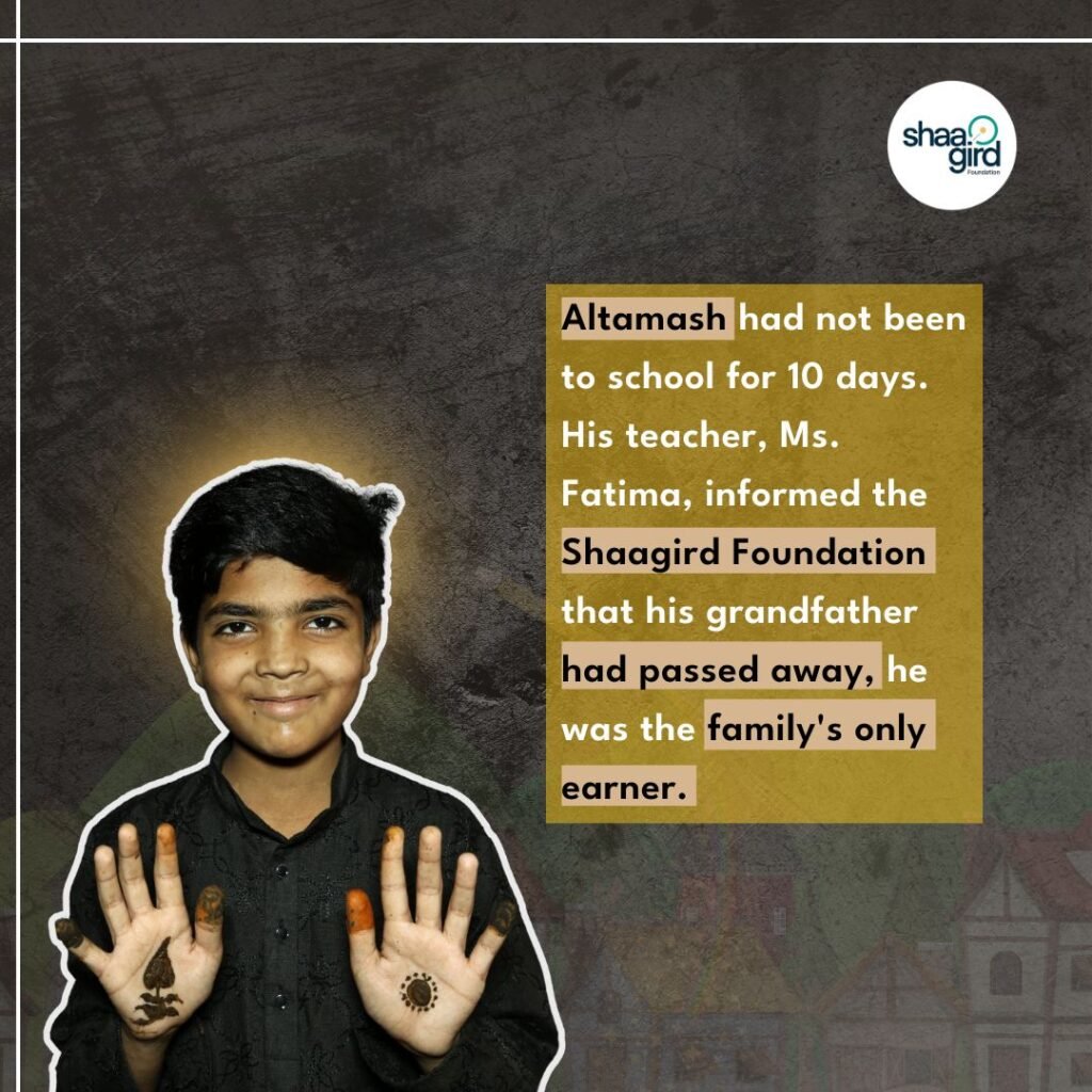 “Sir, Altamash 10 din se school nhi aa raha hai… (“Sir, Altamash has not been coming to school for the past 10 days.”) Ms. Fatima, one of the teachers of Sunrise Public School, called and informed the Shaagird Foundation.