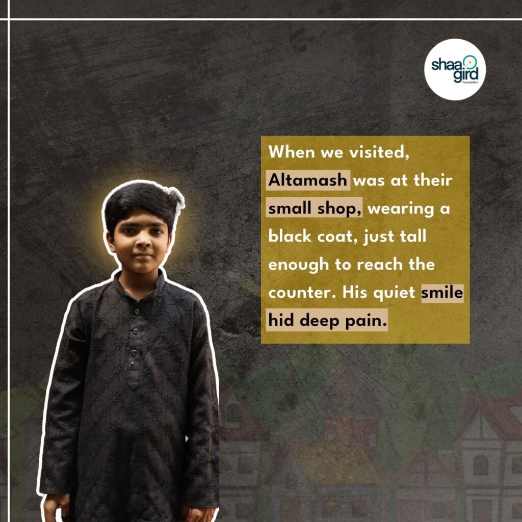The team of the Shaagird Foundation went to Altamash’s house to provide him solace and comfort. However, what we saw left us aghast. Altamash was standing in front of the shop’s counter, wearing a black coat, just tall enough to reach the counter.
