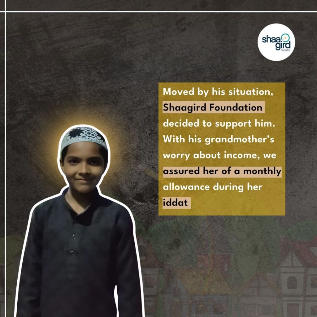 With the assistance of Ms. Fatima, we communicated our decision to help Altamash restart his education to his grandmother. Altamash’s grandmother seemed worried about the source of income. To erase her apprehension, we promised to provide them a monthly allowance until iddat (the period a woman must observe after the dissolution of her marriage, whether through death or divorce, before she can remarry).