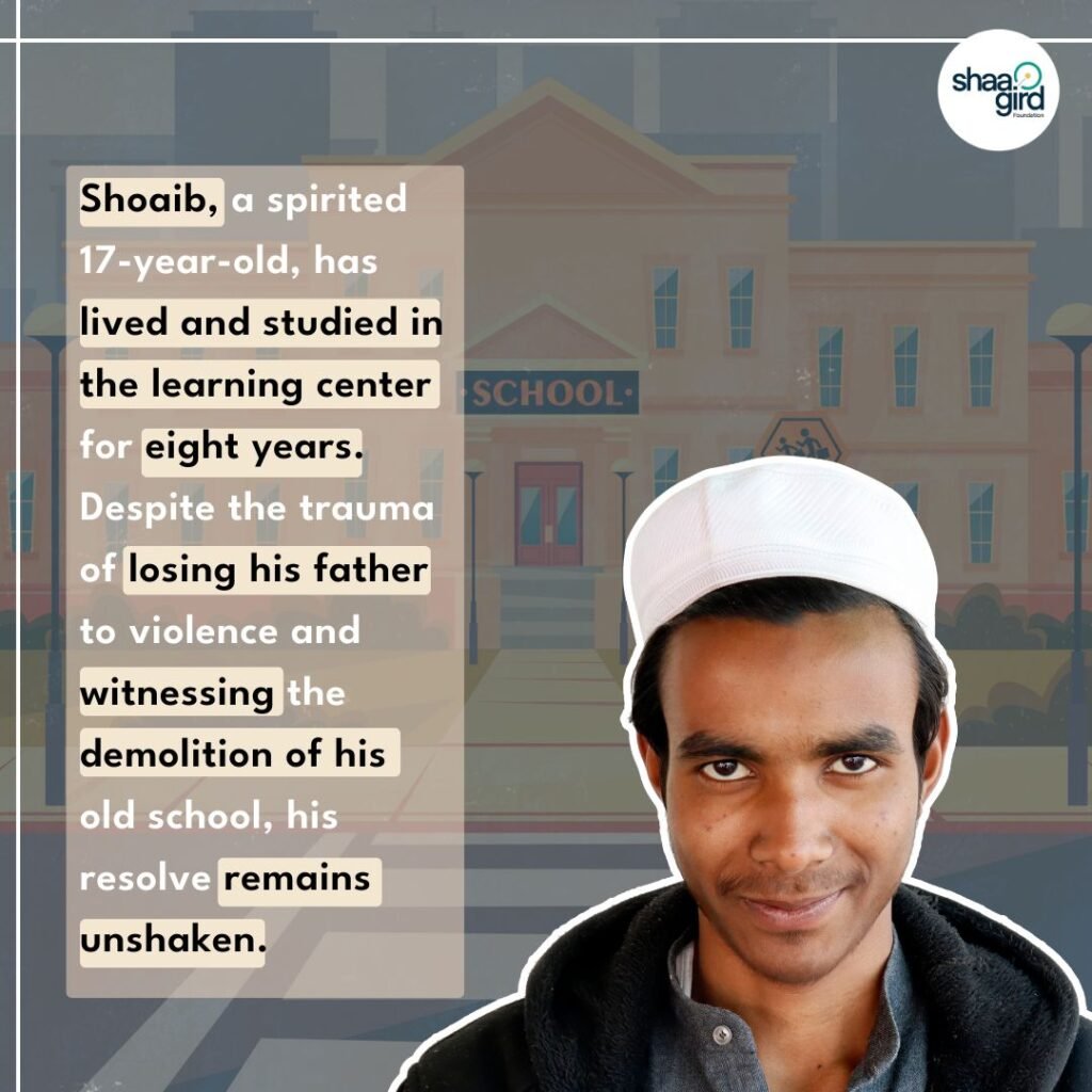 Shoaib is a lively 20-year-old from Mathura, a small town. He has been residing in the learning center’s halls for the past eight years, where his educational journey has taken shape. As he prepares to face his tenth-grade exam, his eyes betray a hint of sadness.