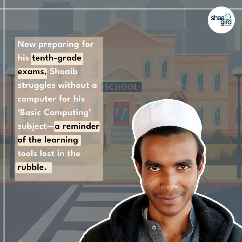 Even though the Shaagird Foundation provided him with notebooks, we were unable to retrieve his lost work. While Shoaib currently faces difficulties preparing for his ‘Basic Computing’ exam due to not having access to a computer, we aspire for other children to not endure similar challenges, thus Our goal is to furnish children with the necessary tools, including computers, to facilitate their education.
