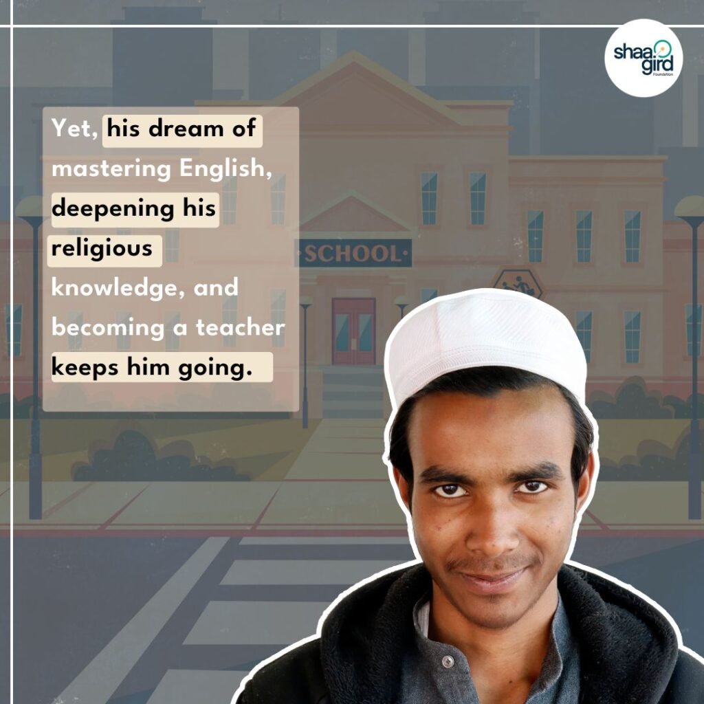 Despite facing numerous hardships, Shoaib’s spirit remains resilient. As a Quran Hafiz, he has memorized the holy book and mastered the complexities of Tajweed. Proficient in Hindi and Urdu, he harbors a strong desire to learn English. “I love English; I aspire to speak it fluently,” he exclaims passionately.