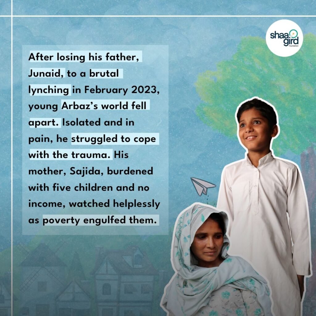 11 year-old Arbaz, who seemed unmoved, recollecting his time spent with his father, told Shaagird Foundation that isolation has become his best friend, but why? We thought to ask but could not gather the strength to do so. Maybe because of the fear of getting lynched to death like his father? We preferred to assume.
