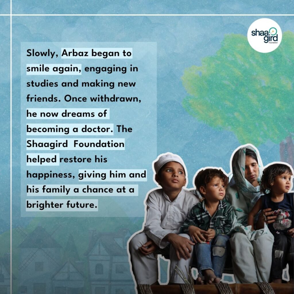 The impact of school has been profound. Once shy, he now exhibits enthusiasm for learning. Arbaz, whose constant companion was dejection, has made new friends. With the help of Shaagird Foundation, his crumbled hopes were raised again, his shattered dreams were repaired, and his demolished life was given a new home.