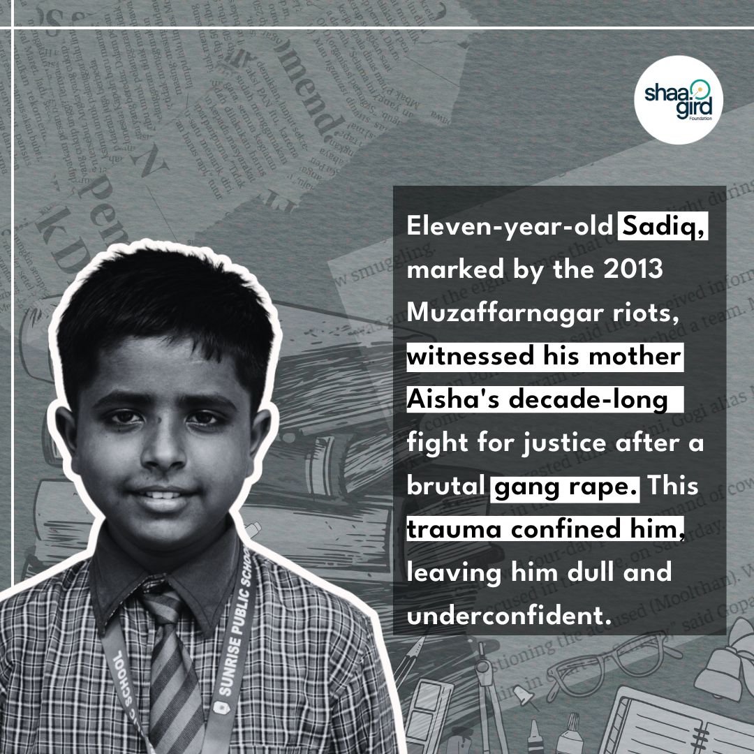 Sadiq, an eleven year old kid, holds more stories than his age. His innocent eyes and golden heart have witnessed dehumanisation beyond the framework of his mind. Sadiq’s ode is not of melody but eerie enough to haunt the universe. He grew up seeing his mother battling a decade-long journey for justice. His mother, Aisha* is a gang rape survivor during the Muzaffarnagar riots of 2013.