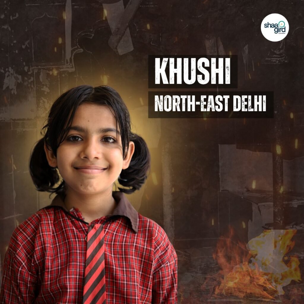 While wandering around the dark- burnt lanes of Mustafabad, her mother found hope in a smile. She saw a yellow tent with people radiating rays of optimism. On getting closer, she learnt it was a camp organized by the Shaagird Foundation.