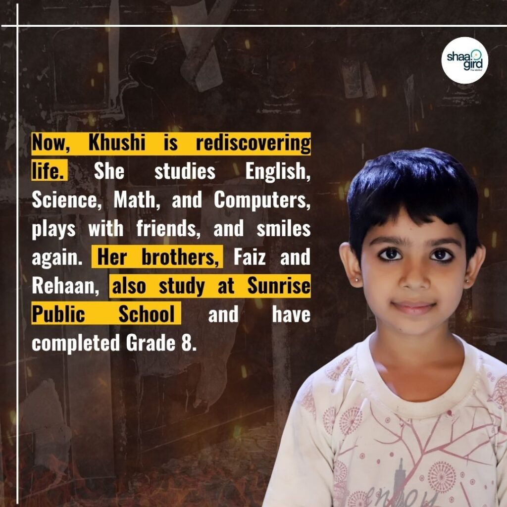 After meeting Shaagird and getting in touch with Sunrise Public School, Khushi is healing from the scars she doesn’t even deserve. She studies with her peer group and plays with them during her lunch break.