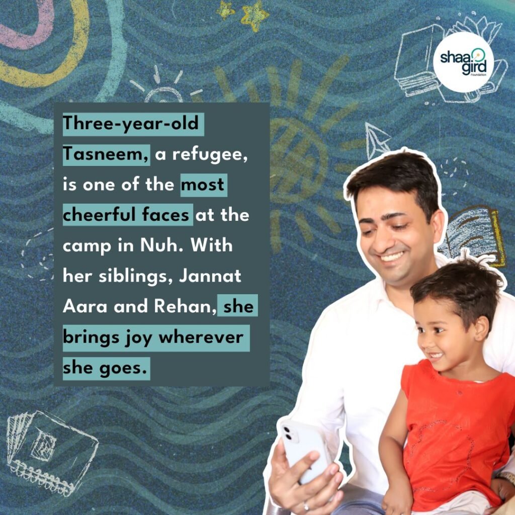 Tasneem, a bright-eyed and spirited three-year-old girl, is one of the most cherished children at the refugee settlement in Nuh. With her infectious smile and warm demeanor, Tasneem has quickly become a symbol of resilience and hope for everyone who visits. She lives with her elder sister, Jannat Aara, and her younger brother, Rehan, forming a trio of joy and love that brings life to the otherwise challenging environment of the camp. All three siblings are affectionate, full of energy, and a joy to be around.